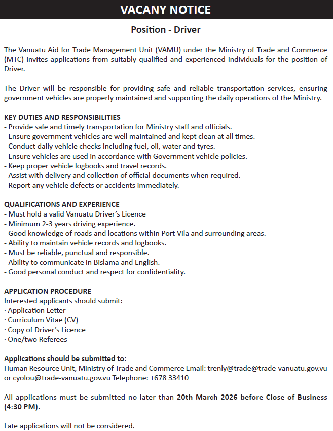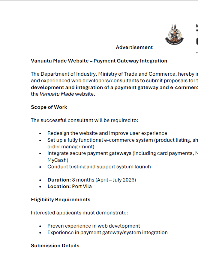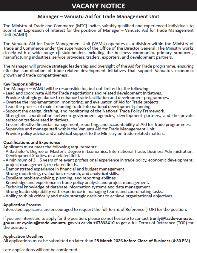 The Ministry of Trade, Commerce, Tourism and Cooperatives (MTCTC), Vanuatu leads the Governmentโs efforts to foster inclusive and sustainable economic growth. We focus on developing trade, commerce, tourism, and cooperative enterprises to empower Ni-Vanuatu communities and businesses